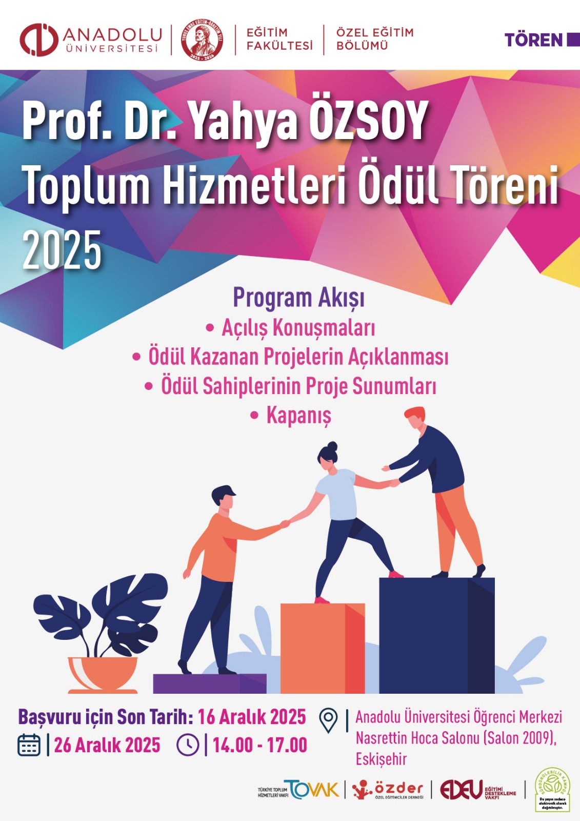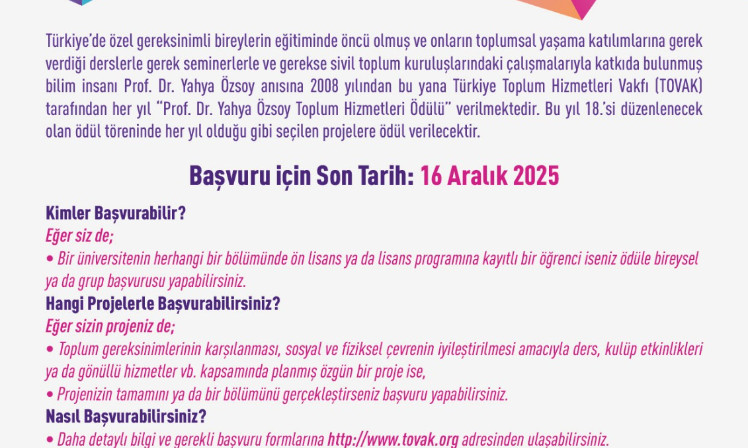 Özel eğitim alanının Türkiye’deki öncülerinden olan Prof. Dr. Yahya Özsoy; 50 yılı aşkın meslek yaşamında, çevresine örnek olmuş ender bir bilim insanı ve aile babasıydı. Bütün bilgi ve enerjisini, Türkiye’deki özel eğitim alanının gelişmesi ve genişlemesi için seferber eden bu eşsiz insanı 26 Aralık 1996’da yitirdik. Ömrü boyunca dur durak bilmeden çalışan gerçek eğitimci, sevgi, hoşgörü ve bilim adamı Özsoy Hoca’nın anısını yaşatmak, onu tanıyanlar için bir minnet borcudur. Dahası, bu ülkenin insanları için verdiği örnek mücadelesini gençler aracılığıyla sürdürmek; onu anmanın, onu unutturmamanın en anlamlı yolu olacaktır. Bu amaçla, 2008 yılından başlayarak vakfımızca her yıl “Prof. Dr. Yahya Özsoy Toplum Hizmetleri Ödülü” verilmesi kararlaştırılmıştır.